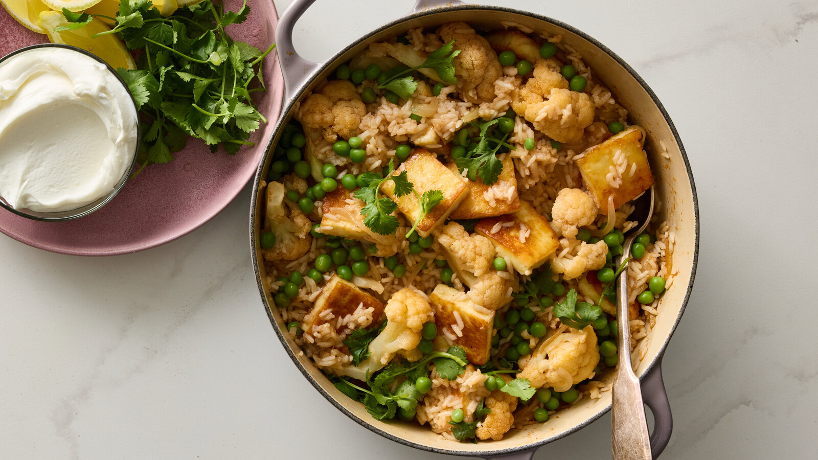 Drain the rice. Stir the cauliflower, peas, paneer and drained rice into the broth. Bring to a boil, stir to evenly distribute the ingredients and cover with a tight fitting lid. Reduce heat to low and cook, undisturbed, for 20 minutes. Use a big spoon to fluff the rice and gently stir in the cilantro, then cover and let rest for 5 minutes before serving with lemon wedges, a dollop of yogurt and more cilantro to garnish.