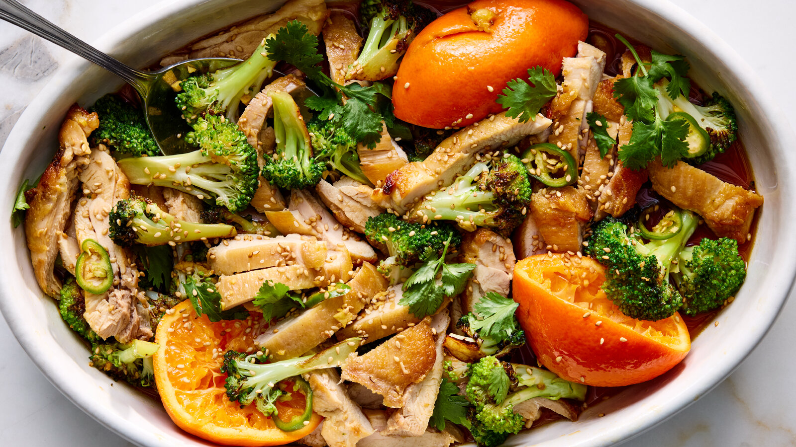 Thinly slice the chicken, then serve with the broccoli topped with cilantro, sesame seeds and plenty of sauce. (Feel free to discard or leave the squeezed citrus to continue to perfume the sauce; it is not especially enjoyable to eat, however.)