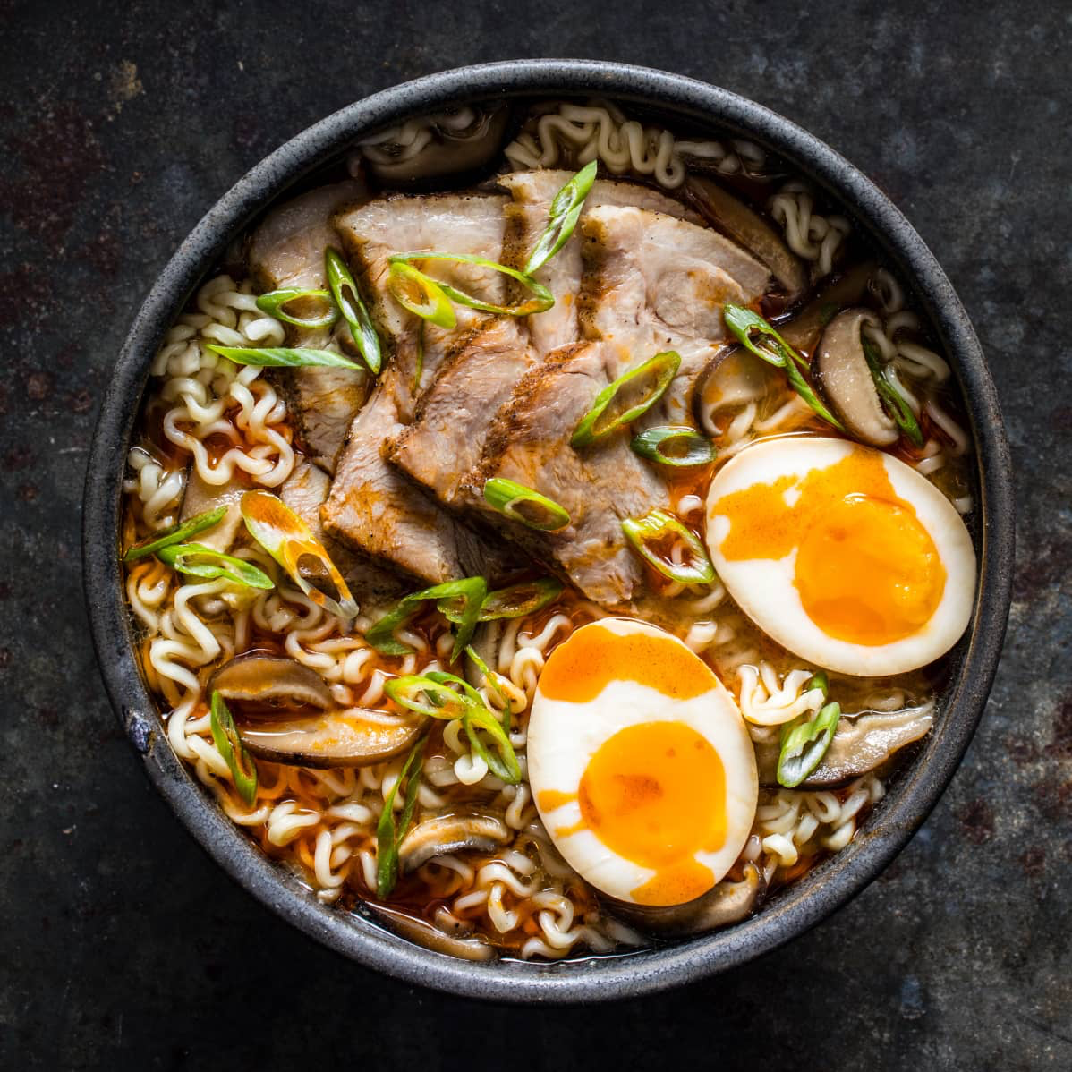 We're busting out the slow cooker again. It sounds like a lot, but 2.5lbs of boneless pork butt roast is not a lot. You're gonna trim off a 1/4lb slab of fat to start with, and it's going to cook down to a much smaller size. It's fine for 4 hearty servings, but you'll have a ton of broth left over. If you want expand this to feed six (or figure in leftovers) going to 3 or 3.5 lbs (even with two roasts) with same broth amount is totally fine. And it's totally cool to use those instant ramen noodles here. They'll taste great.