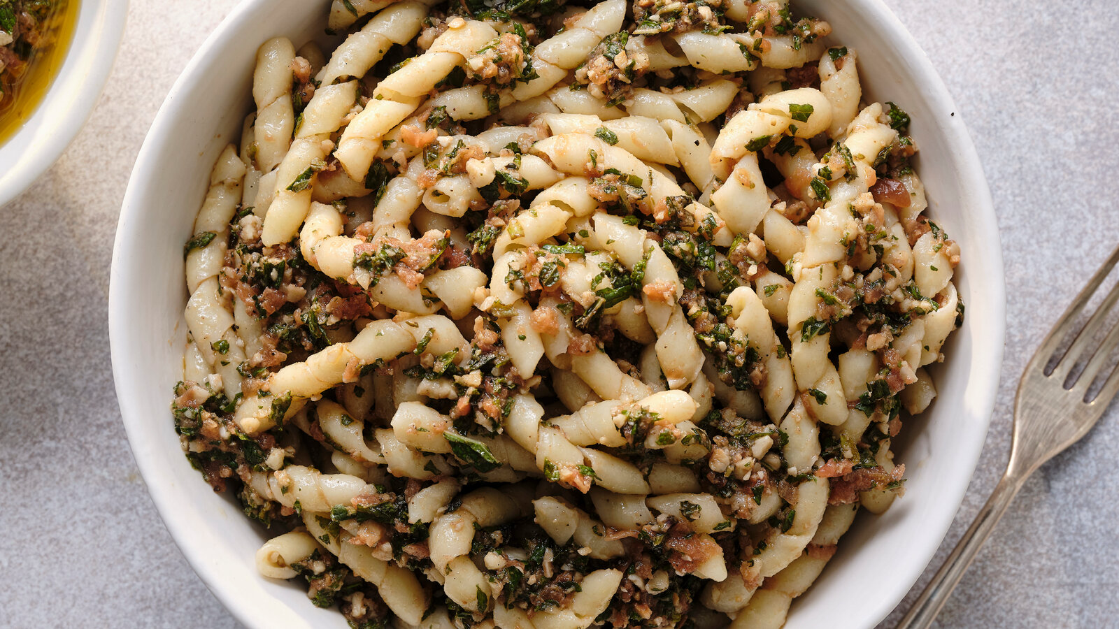 Reheat the same pot of water to a boil on high. Add salt and cook the pasta according to package directions. To serve, toss the pesto with the cooked pasta and pecorino.
