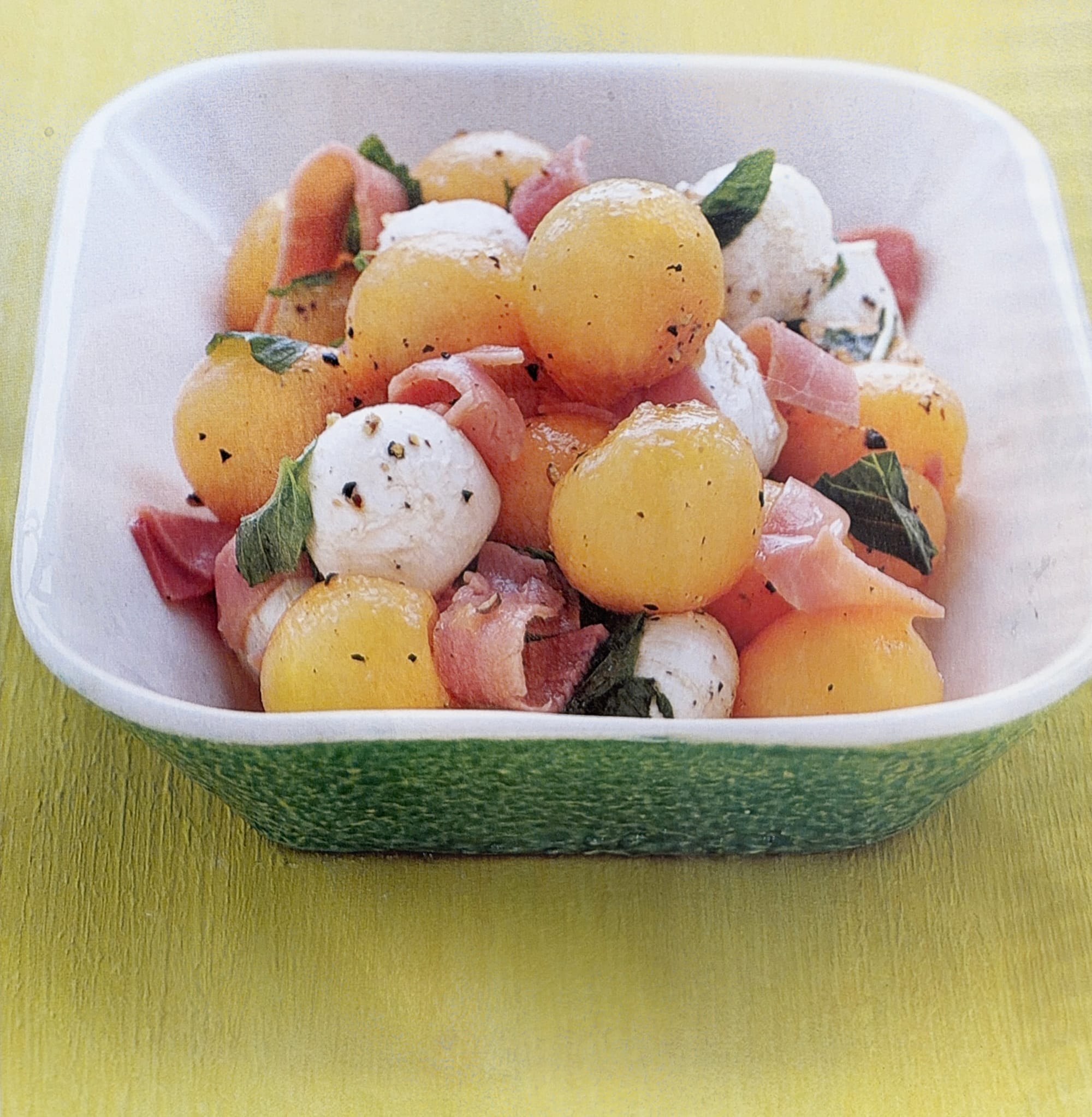 - Scoop the cantaloupe into 1-inch balls with a melon baller; you should have about 3 cups. In a large bowl, combine the cantaloupe balls, bocconcini, ham, and lemon juice; season with salt and pepper.