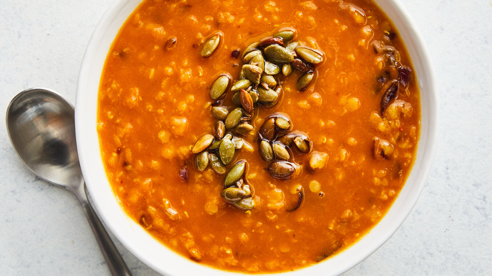 Add the lentils, pumpkin, turmeric, paprika, coriander, red pepper, cinnamon, 1 tablespoon olive oil and 1 tablespoon salt to a 6- to 8-quart slow cooker; top with 5 cups water and stir to combine. Cook on high for 4 hours or on low for 6 hours, until the lentils are tender. (This soup holds well on warm if you need flexibility.)