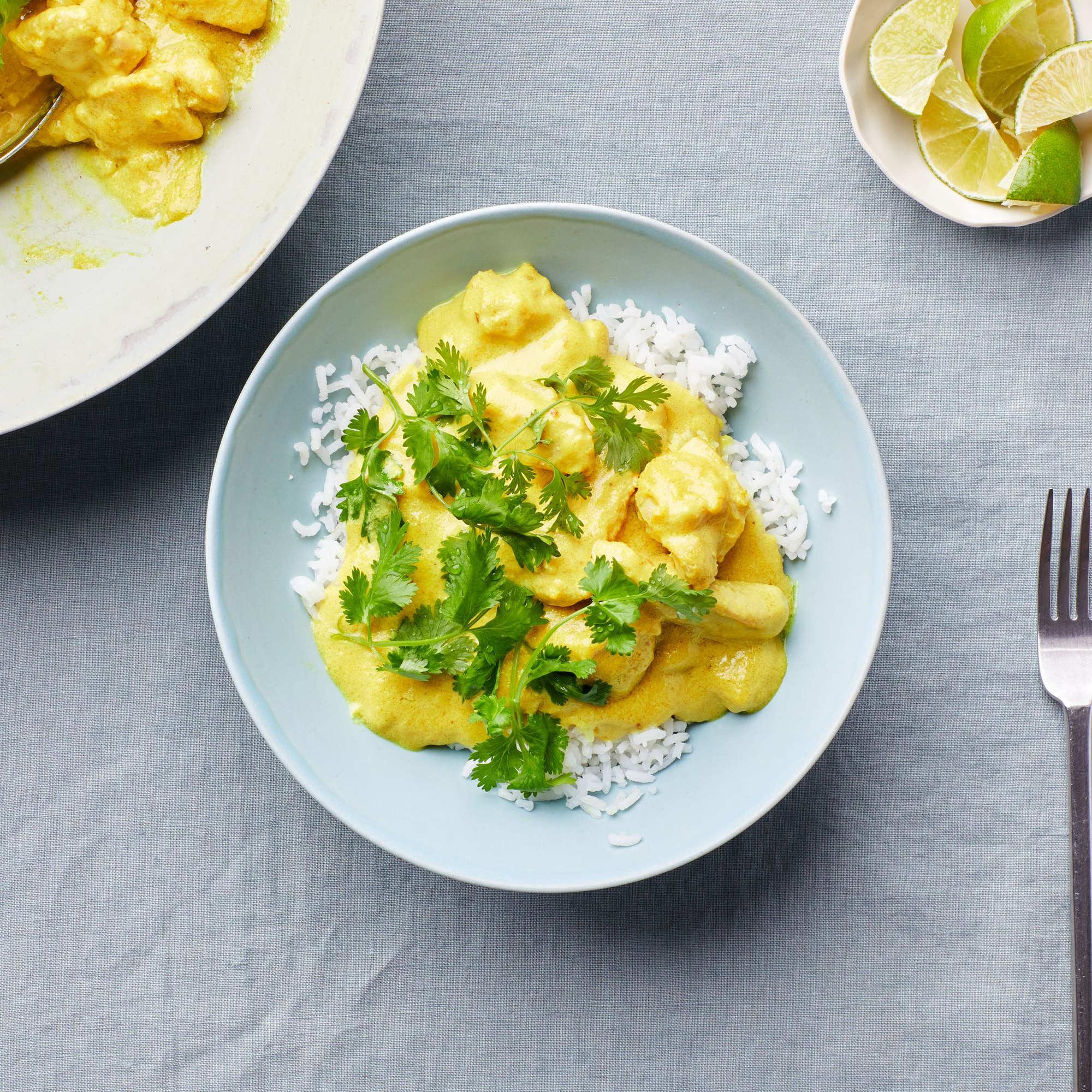 Steamed rice, cilantro sprigs, and lime wedges (for serving)