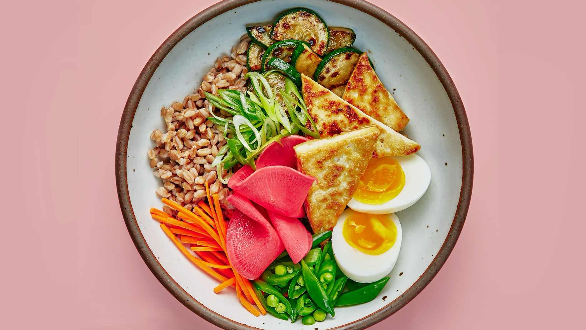 To serve, divide farro among bowls. Arrange eggs, drained pickled radish, tofu, zucchini, and raw vegetables of choice on top as desired. Drizzle each bowl with a few spoonfuls of dressing to your liking.