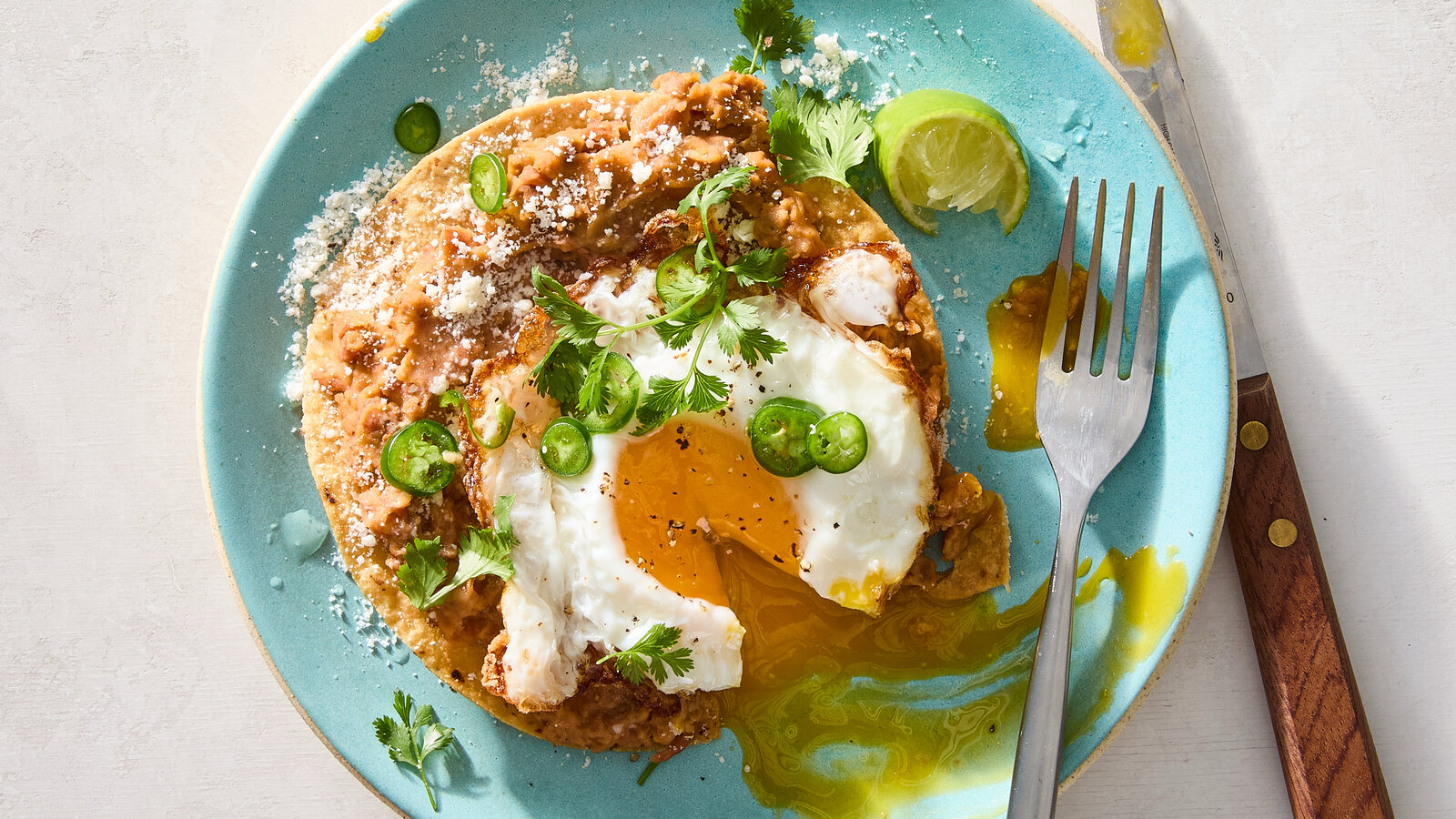 Spread a layer of the bean-chorizo mixture onto a tostada. Generously coat with cotija. Top with a fried egg, cilantro and serrano chiles to taste. Repeat with the remaining tostadas. Serve with lime wedges and hot sauce or salsa.