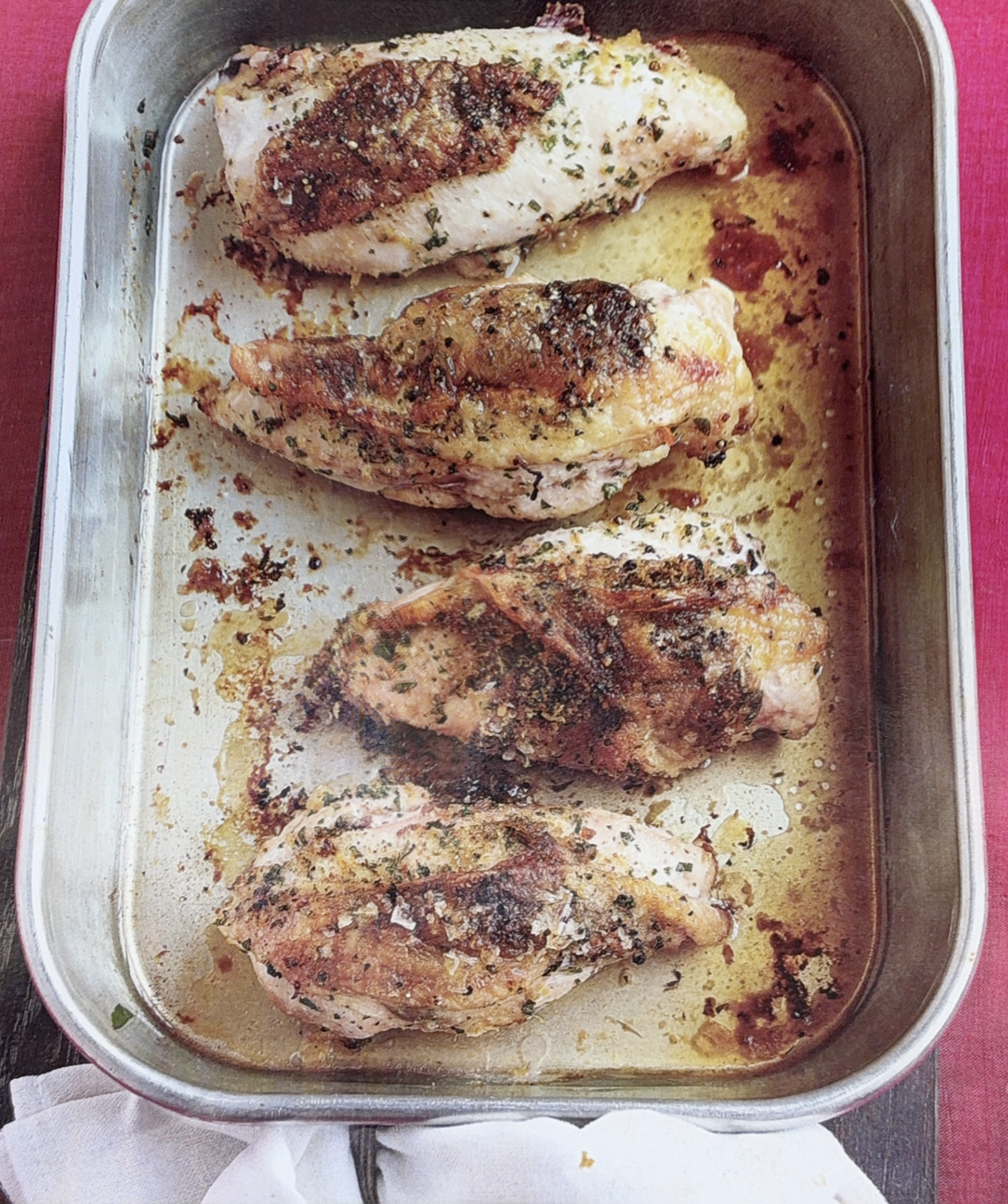 2 Divide the parsley mixture into 4 mounds. Carefully loosen the chicken skin with fingers; tuck the parsley mixture under the skin. Season the chicken with salt and pepper. Place in a 9-by-