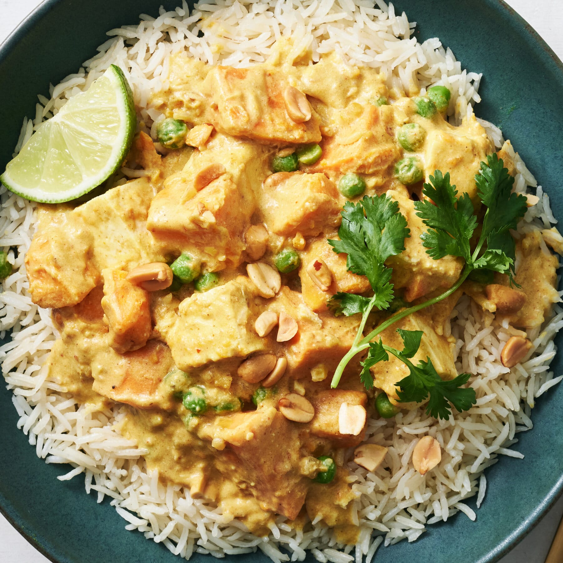 Serve over rice. Top with cilantro leaves and chopped peanuts, with lime wedges on the side.