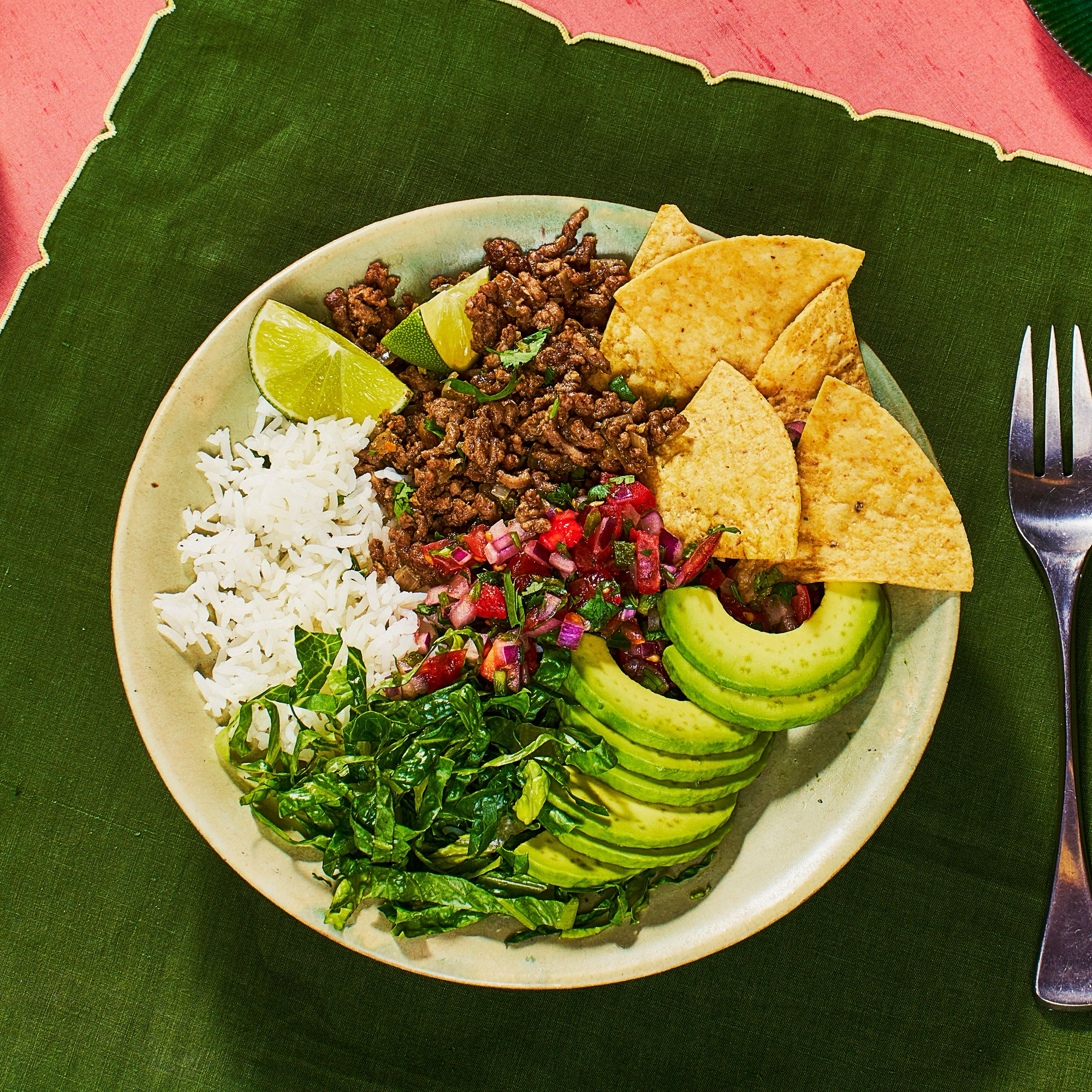 Divide spiced beef and cooked rice among bowls. Serve with sliced avocado, tortilla chips, shredded lettuce, lime wedges, and reserved salsa.