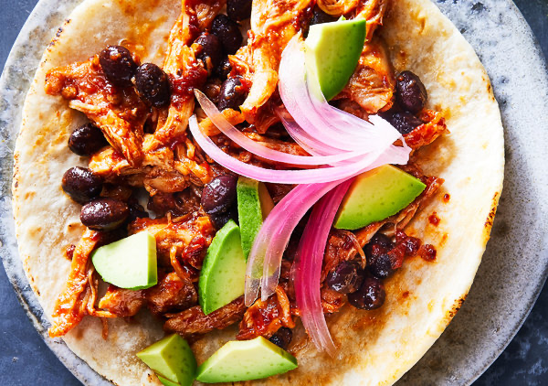 Using two forks, coarsely shred the chicken in the sauce. Stir in the black beans and lime juice. Cover and let the beans warm through, about 5 minutes. Taste and add more salt or lime juice if necessary. Serve in tortillas with pickled onion and avocado.