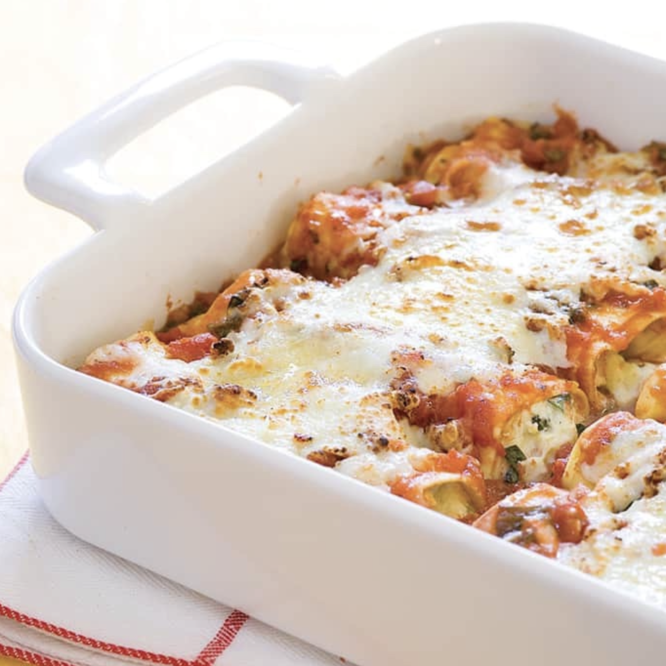 - Meanwhile, combine ricotta, 1 cup mozzarella, 1 cup Parmesan, egg, cup basil, browned veggie crumbles and salt in bowl. Spread half of pasta sauce in bottom of baking dish. With short side facing you. spread 1/4 cup cheese mixture on each noodle, roll, and arrange seam side down in casserole dish. Pour remaining pasta sauce over roll-ups.