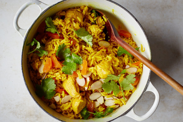 Transfer chicken and rice to a bowl, taking care to remove and discard cardamom pods and star anise. Garnish with apricots, almonds and cilantro. Serve at once.