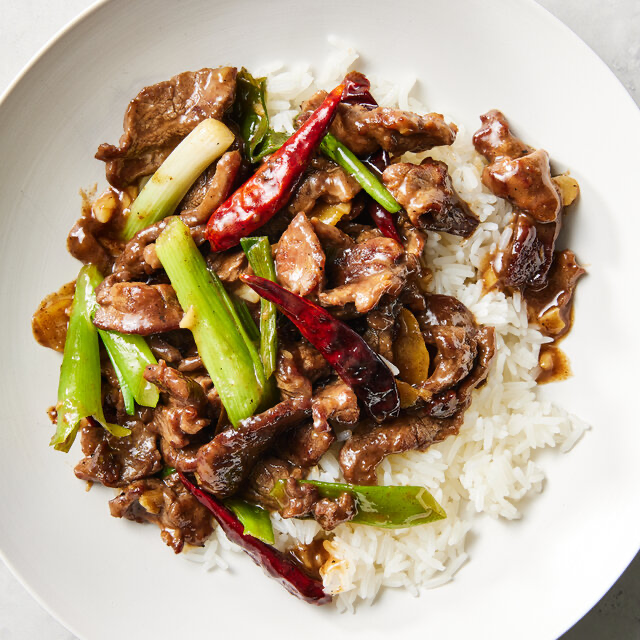 Heat 2 tablespoons of the oil in a wok or large (12-inch) well-seasoned cast-iron skillet over high heat. Once the oil is shimmering, add the beef in an even layer. (This might need to be done in 2 batches.) Do not touch the beef until the edges become slightly crispy and brown, 30 to 60 seconds. Using a wooden spoon or spatula, flip the beef and cook until the other side is brown, another 30 to 60 seconds. The beef should not be sticking to the wok or skillet; if it is, leave it alone for 20 to 30 seconds more. Transfer the beef to a medium bowl, trying your best to leave as much oil as possible in the wok. If cooking a second batch, repeat browning, adding another 1 tablespoon of oil if necessary.