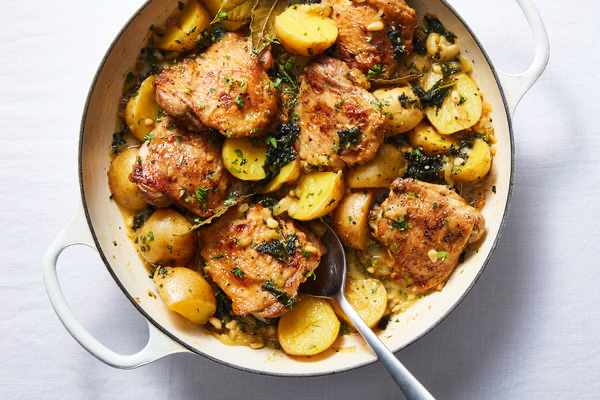 In a Dutch oven large enough to hold the chicken in one layer, heat the olive oil over high until shimmering. Season chicken pieces on the skin side with salt and pepper, then lay them in the pan, skin-side down. Adjust the heat so they sizzle but do not pop or scorch. Cook until skin is deeply browned and comes away easily from the pan, about 10 minutes. Remove and set aside.
